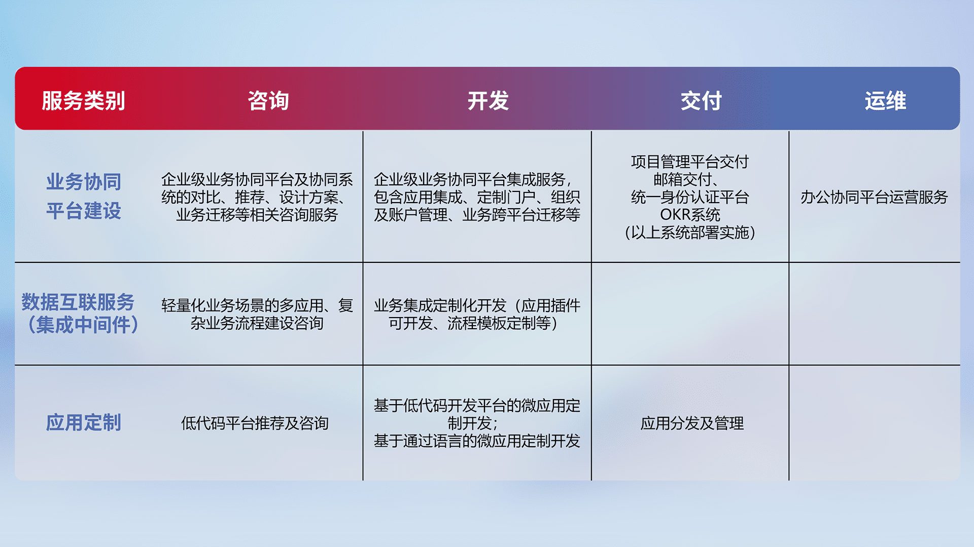 针对钉钉、、、、企微、、、、IDaas等平台级产品提供产品的规划、、方案、、交付、、、、定制化开发等服务,,,实现如统一协同办公、、、智能客户服务、、混合会议管理、、、智能数据查询、、等业务场景,,实现数字化转型。。。。